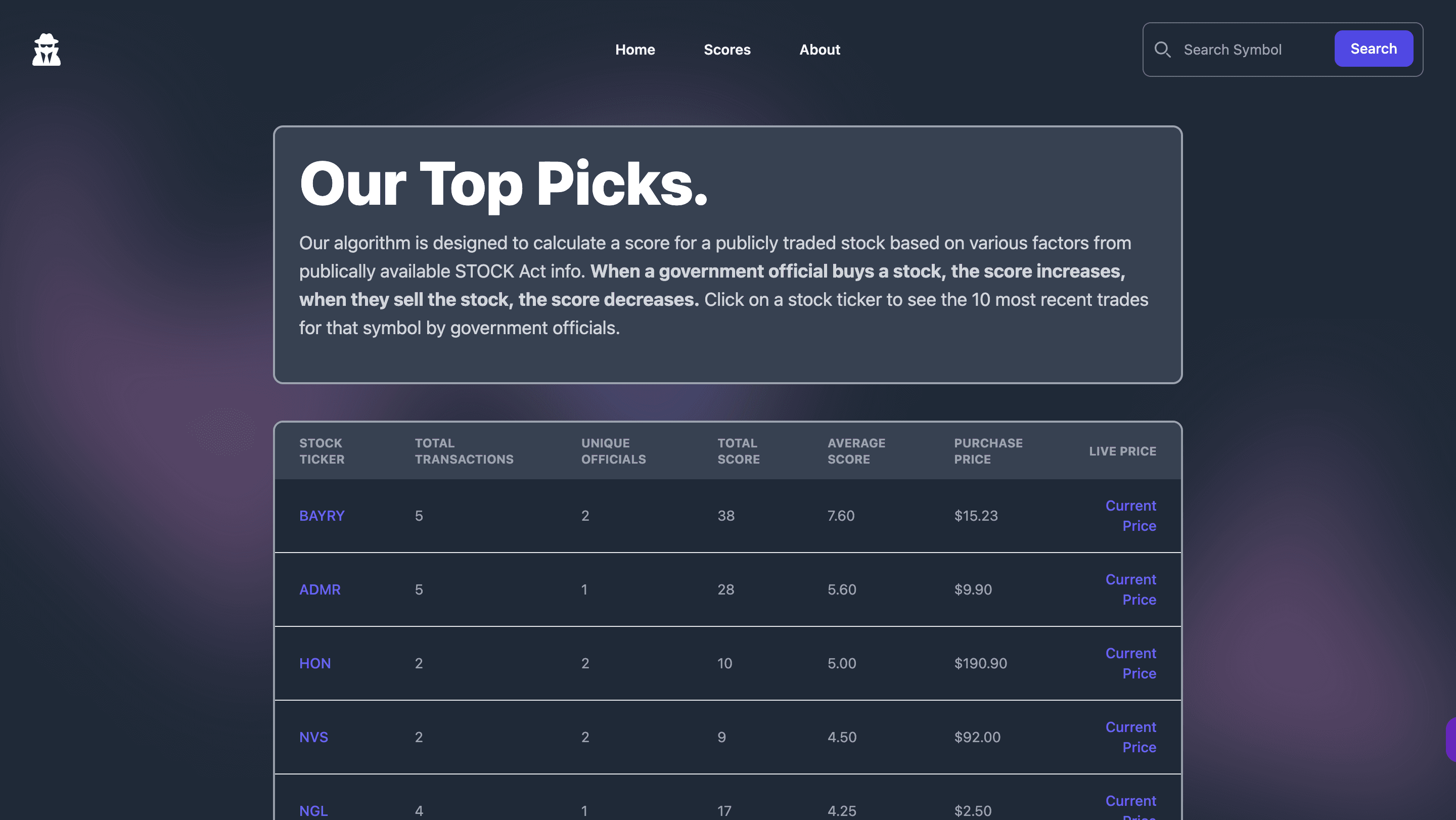 This project was built to identify high potential stock options based on congressional trading trends. The algorithm I designed calculates a score for a stock based on various factors from publically available STOCK Act info. In short, when a government official buys a stock, the score increases, when they sell the stock, the score decreases. Here is the Live Link to the project.